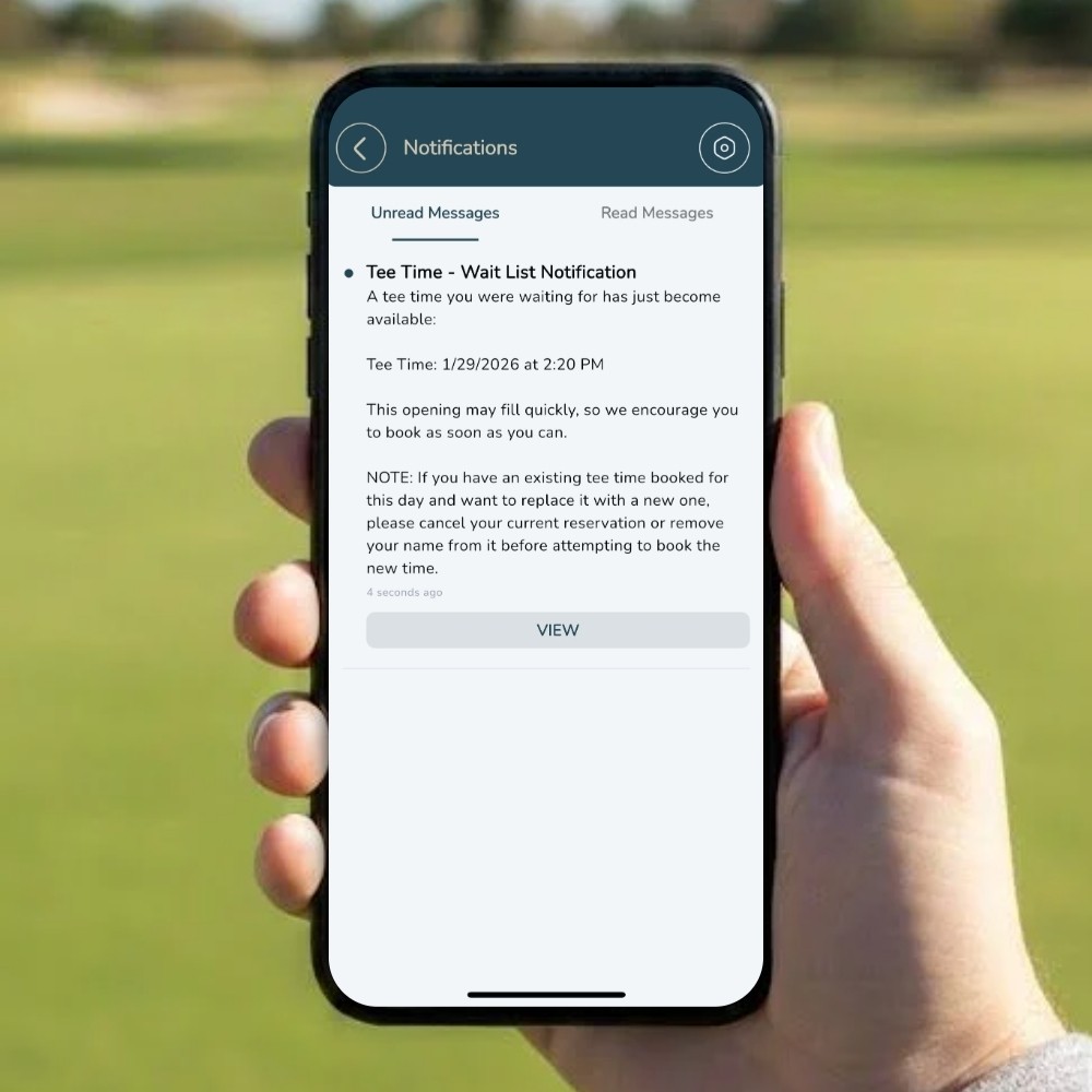 Staff can build a wait list that will automatically assign members to a tee time inside their desired time range. Member(s) choose a time range. If a time within that range opens, they will be automatically added to that time, which then triggers a reservation confirmation email and push notification in the ClubCentral app. Depending on your cancellation policy, member(s) will still be able to modify their tee time assignment.