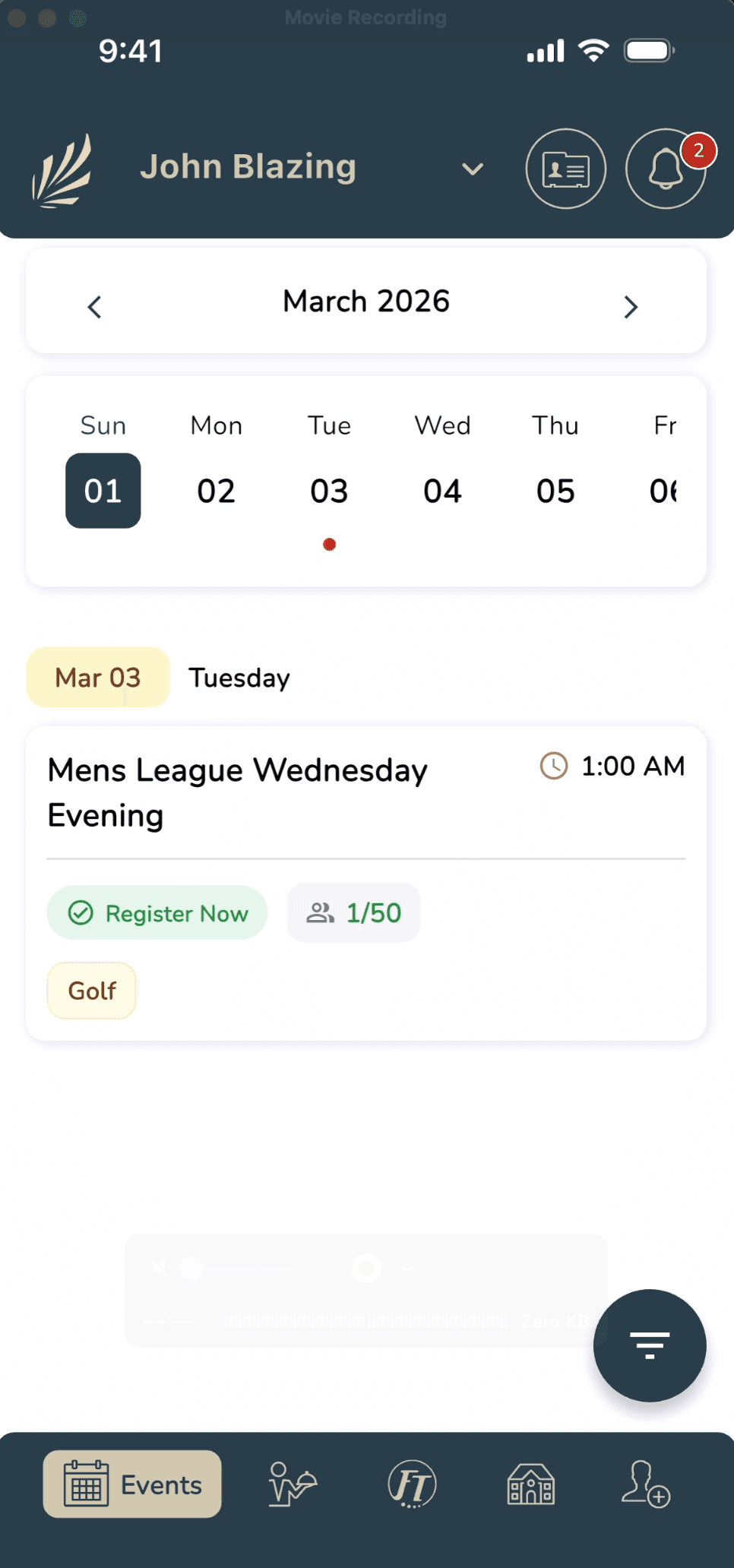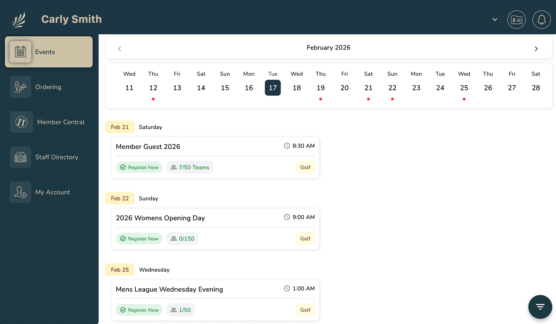 Track revenue by greens fees, carts, tournaments, and member play.
